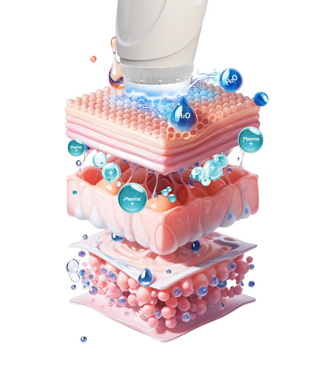 高频电场电离空气:通过高频电场激发空气中的氧气和水分,生成高活性等离子体(包含微电流、离子流及中性自由基),形成温和的能量场作用于皮肤表层。